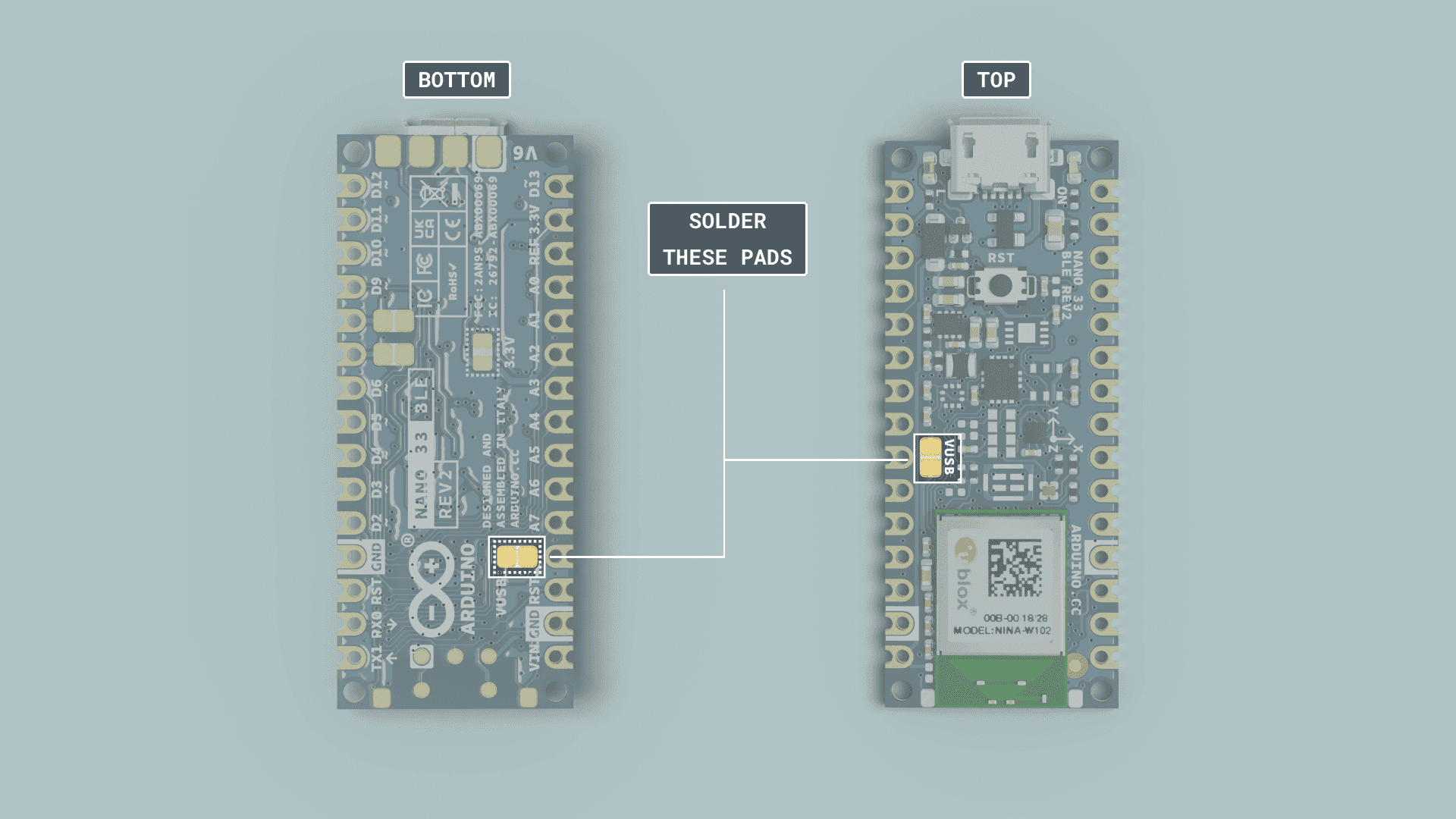 To avoid such risk with existing projects, where you should be able to pull out a Nano and replace it with the Nano 33 BLE Rev2, we have the 5V pin on the header, positioned between RST and A7 that is not connected as the default factory setting. This means that if you have a design that takes 5 V from that pin, it won't work immediately, as a precaution we put in place to draw your attention to the 3.3 V compliance on digital and analog inputs.