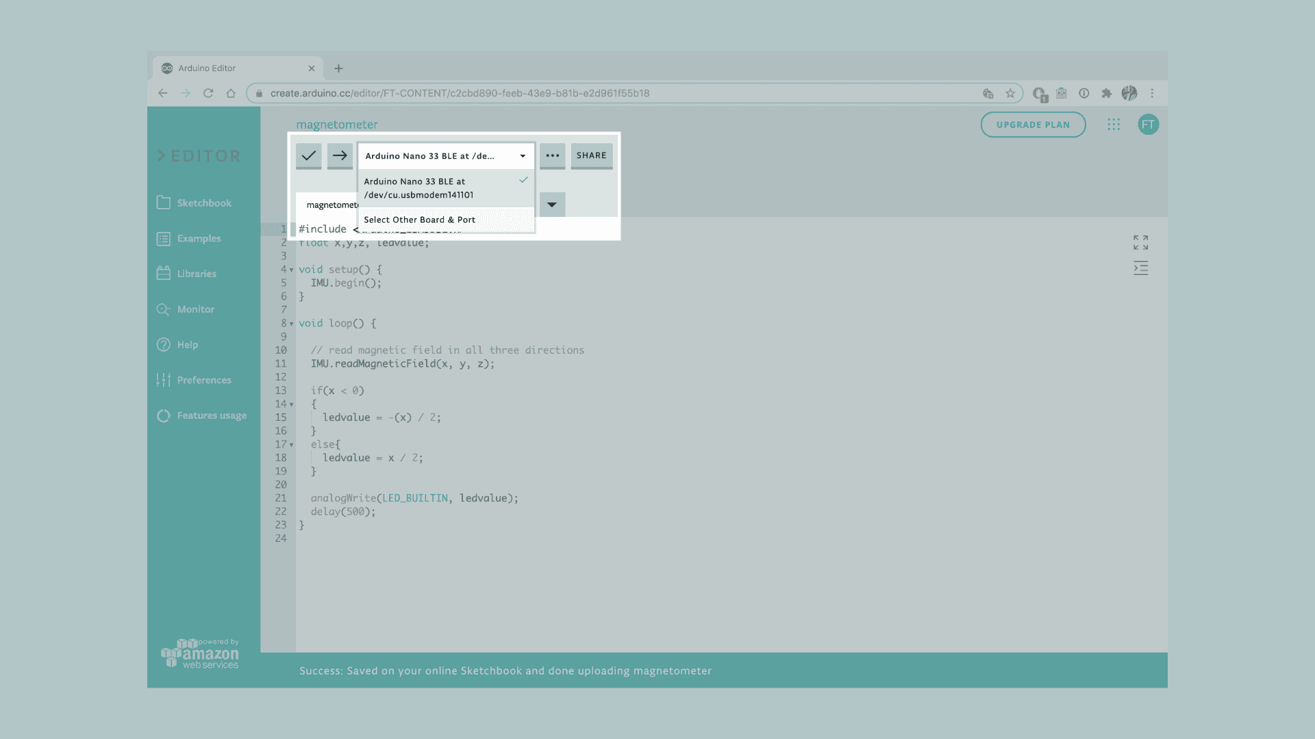 Next, connect the Arduino Nano 33 BLE Sense to the computer and make sure that the Web Editor recognizes it. If so, the board and port should appear as shown in the image below. If they don't appear, follow the instructions to install the plugin that will allow the Editor to recognize your board.